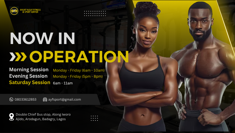 Are you looking for a top-notch fitness center in Badagry that caters to your health and wellness needs? Look no further! Ayisat Yusuf Fitness and Sport Center is now open, offering world-class training sessions in a friendly and motivating environment. Whether you're a fitness enthusiast, an athlete, or just starting your fitness journey, we have the perfect program for you.